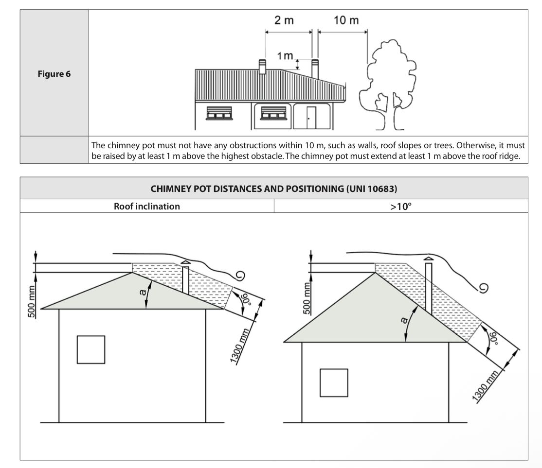 Baca başlığının 10 m yakınında duvar, çatı eğimi veya ağaç gibi herhangi bir engel bulunmamalıdır. Aksi takdirde, en yüksek engelin en az 1 m yukarısına yükseltilmelidir. Baca başlığı, çatı sırtından en az 1 m yukarıda olmalıdır.