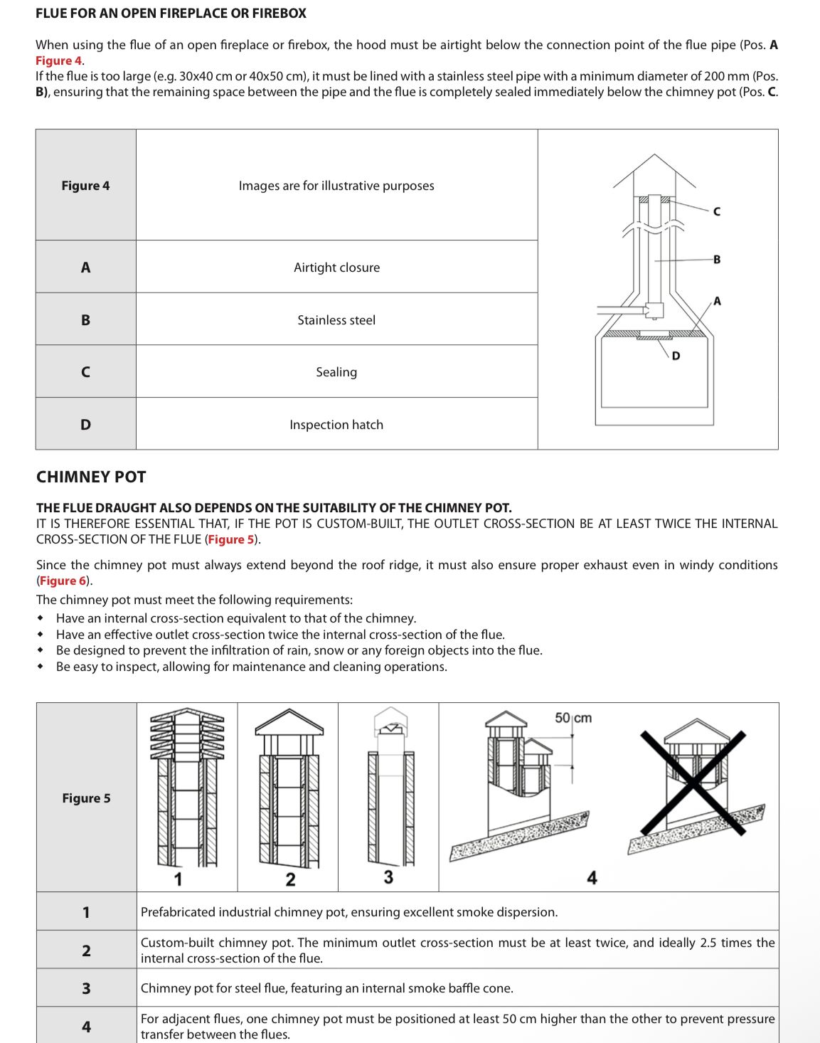 Açık bir şömine veya şöminenin bacası kullanılırken, baca borusunun bağlantı noktasının altındaki davlumbaz hava geçirmez olmalıdır (Poz. A Şekil 4.)