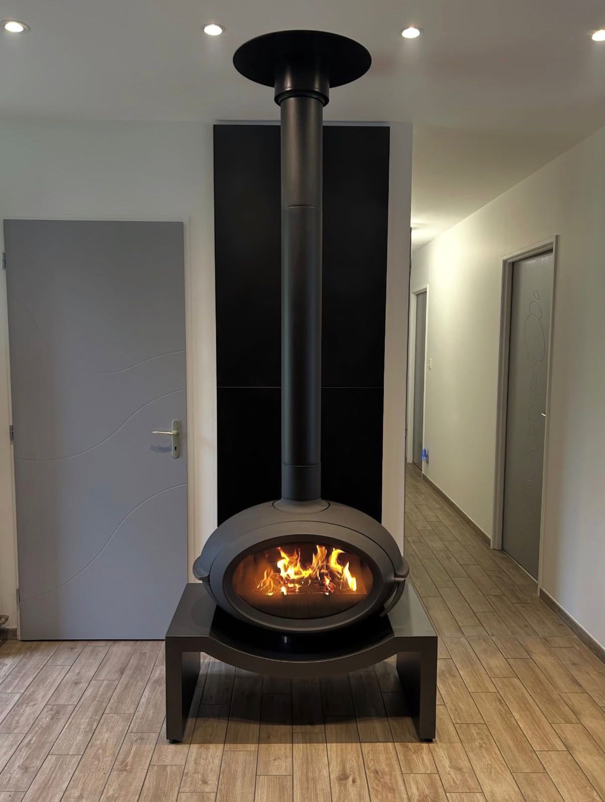Temiz görünümlü çelik bank, oturma odanızda adeta bir gösteri yapmak için dökme demir sobanın şeklini kucaklıyor.