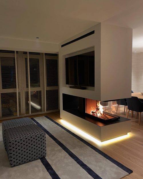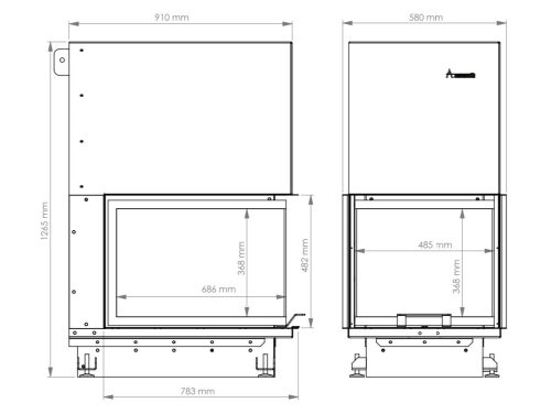 Ana cam cephe 485 mm cam ölçülerinde ve 2 yan cephenin her biri 686 mm ölçülerindedir. Tüm camlı yüzlerin yüksekliği 368 mm ve pencerelerin yüksekliği, 3 taraflı bir şömine için piyasadaki en rekabetçi fiyatla.