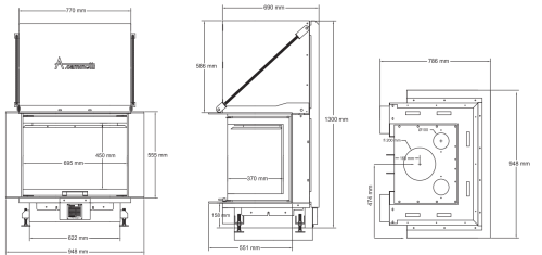 Ana cam cephe 700 mm, 2 kenar 370 mm ve pencerelerin yüksekliği 450 mm olup, 3 taraflı çıkarılabilir ocak için piyasadaki en rekabetçi fiyata sahiptir.
