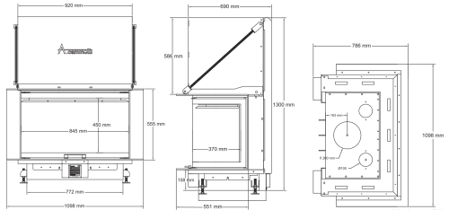 Ana cam cephe 845 mm, 2 kenar 370 mm ve pencerelerin yüksekliği 450 mm olup, 3 taraflı çıkarılabilir ocak için piyasadaki en rekabetçi fiyata sahiptir.