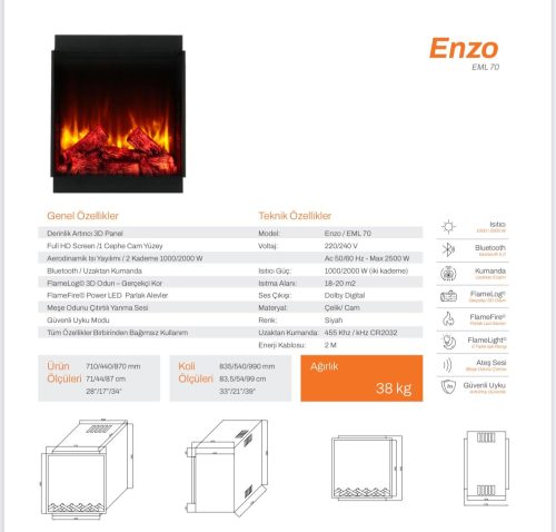 Evinizde, ofisinizde şömine için açılmış bir alan varsa Enzo o boşluğu tam doldurur, 3boyutlu FlameLog odunları ve gerçek meşe odununun yanma çıtırtısı ile gerçeklik algınızı değiştirir ve başka bir dünyanın kapılarını sizin için aralar.