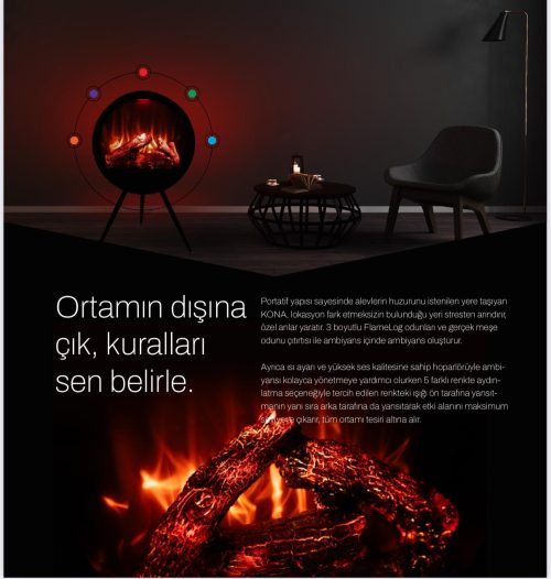 Portatif yapısı sayesinde alevlerin huzurunu istenilen yere taşıyan, KONA, lokasyon fark etmeksizin bulunduğu yeri stresten arındırır, özel anlar yaratır. 3 boyutlu FlameLog odunları ve gerçek meşe odunu çıtırtısı ile ambiyans içinde ambiyans oluşturur.