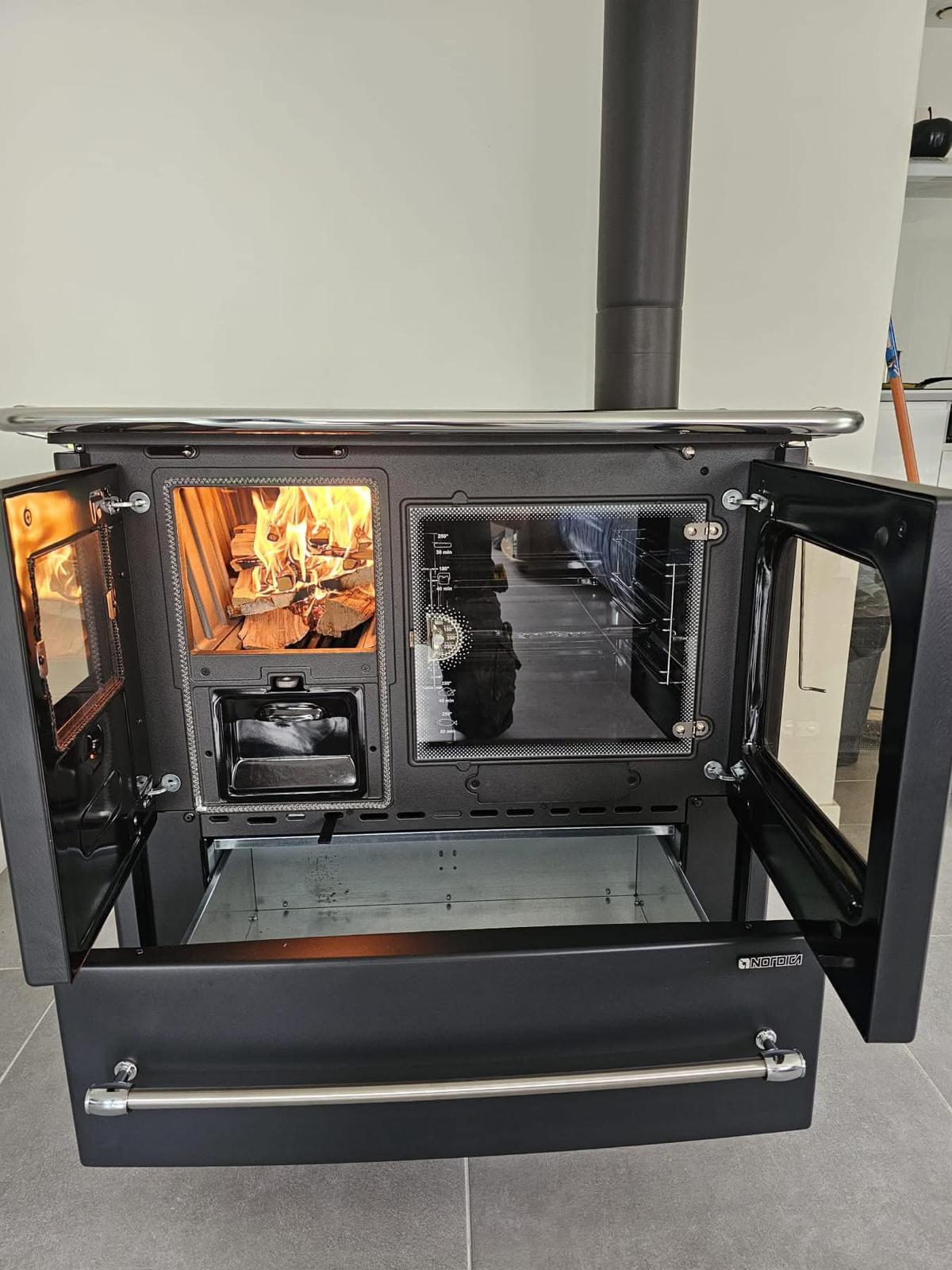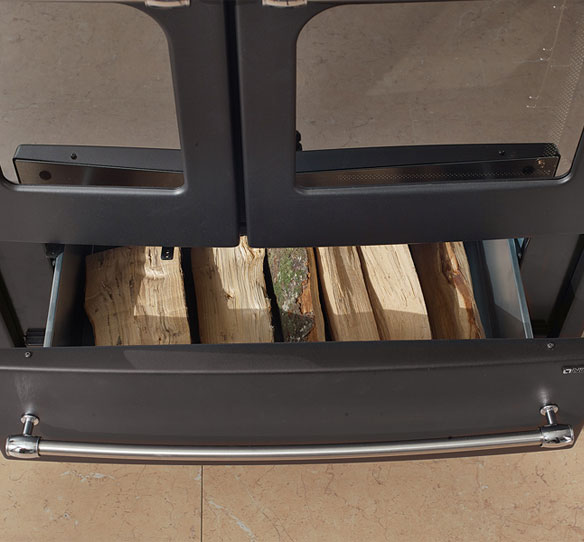 Solda, kapısı çift camlı ve 700 ° C’ye kadar ısıya dayanıklı olan dökme demir yanma bölümü bulunmaktadır. Sağ taraftaki emaye fırında üç fırın tepsisi veya bir ızgara için yer vardır. Teslimat kapsamına bir fırın tepsisi dahildir. Büyük, iki bölmeli kapı sayesinde yemeklerinizi her zaman göz önünde bulundurursunuz. Kuzinenin alt bölümünde büyük bir depolama çekmecesi bulunmaktadır. Bu bölümde odunlarınızı kurutabilir veya tencerelerinizi saklayabilirsiniz.